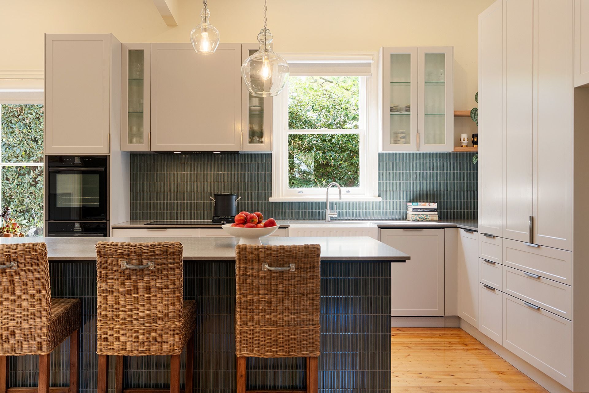 At the heart of the home is a recently completed north-facing kitchen, designed with a refined French country aesthetic. A spacious island bench with stone top and pencil-tile skirt anchors the space, while a butler's sink, induction cooktop with gas hot plate, an integrated dishwasher, and premium Neff appliances, including twin wall ovens, ensure functionality meets style. Soft hues of grey and green create a calming backdrop, and clever storage solutions make this kitchen as practical as it is beautiful.