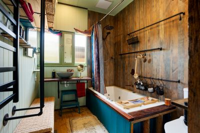 Entry is via the north-facing deck, a generous 4.6m x 3.7m space that captures sunlight and views across the leafy back garden and surrounding landscape. Inside, the country-style kitchen features open shelving, a Bosch dishwasher, a freestanding gas cooktop and oven, and a classic farmhouse ceramic sink. The adjoining dining and living area offers a warm and welcoming atmosphere, featuring a gas heater set into a period fire surround, a split system for added comfort, and direct external access.