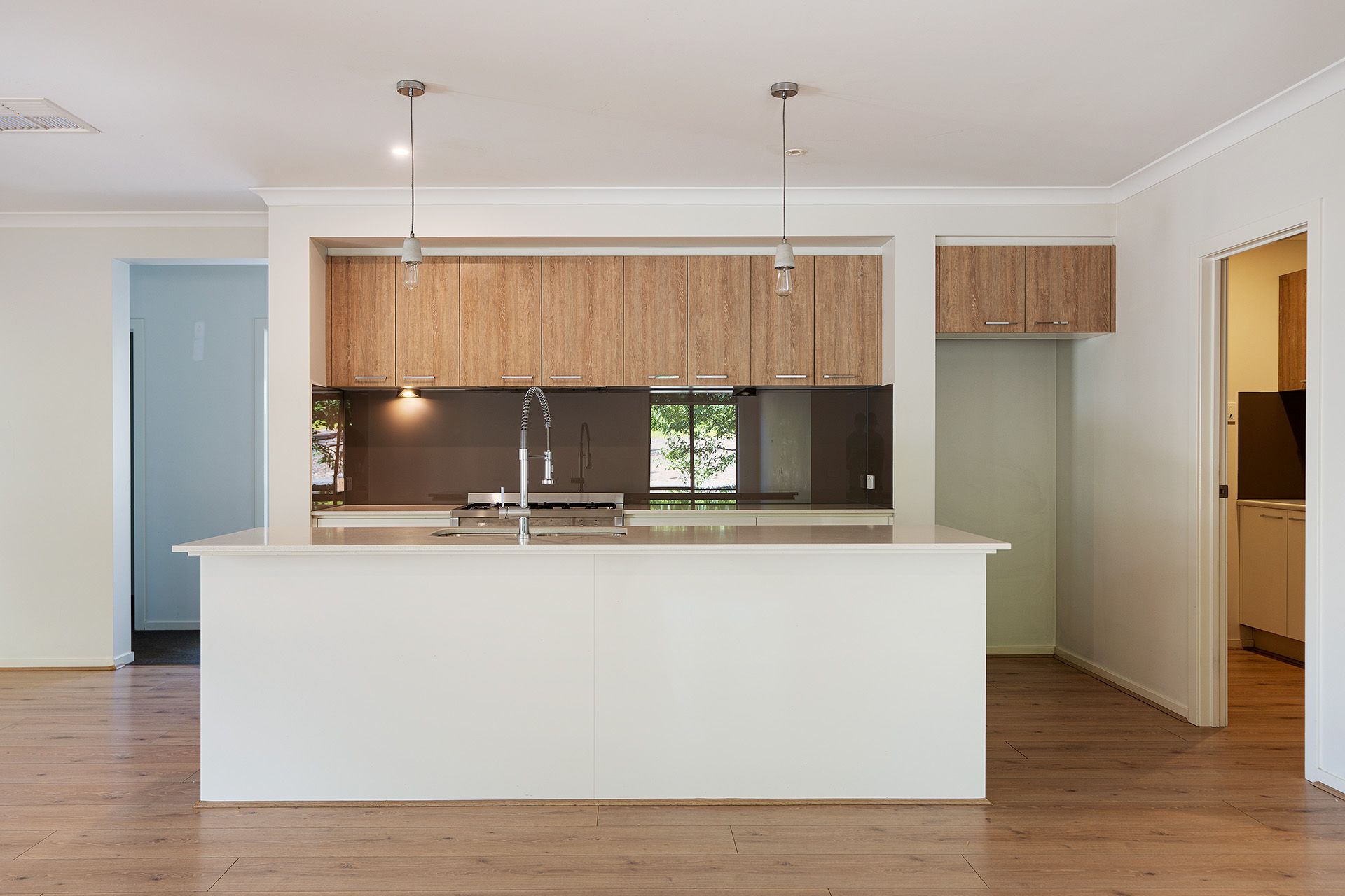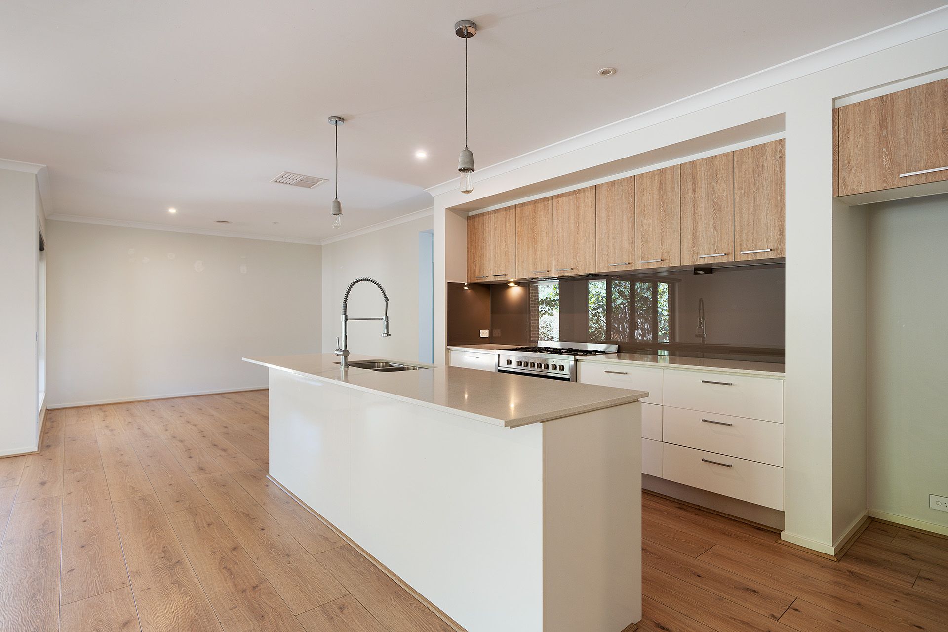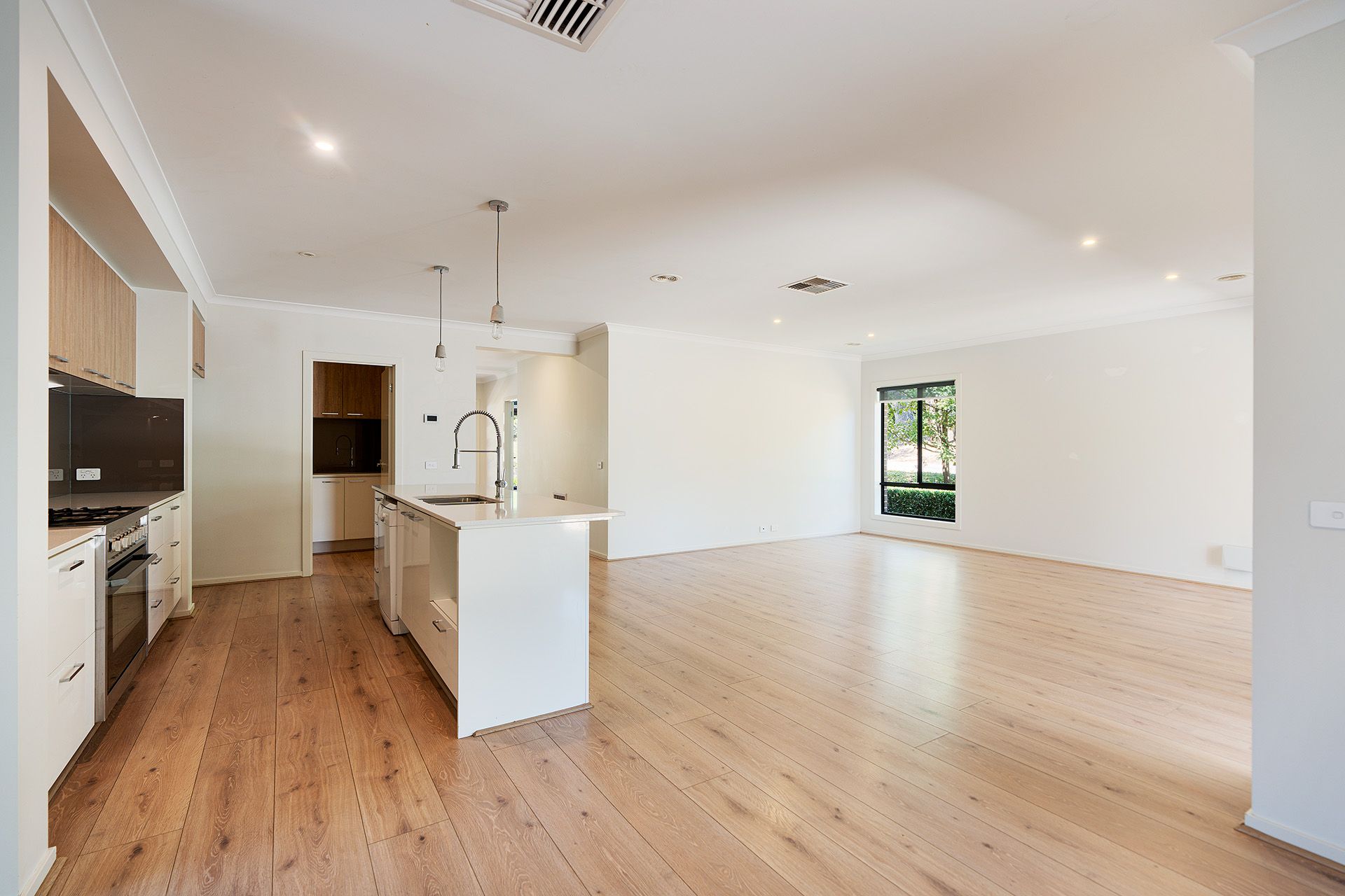Formal living leads into a spacious north-facing open-plan kitchen, dining, and living space. The kitchen is a standout feature with its 900mm gas cooktop, oven, Caesarstone benchtops, island bench for casual dining, walk-in pantry, and dishwasher. Direct access from the kitchen to the double remote-controlled garage adds an extra layer of practicality. The living area opens onto the alfresco space with a ceiling fan, perfect for year-round entertaining and outdoor living.