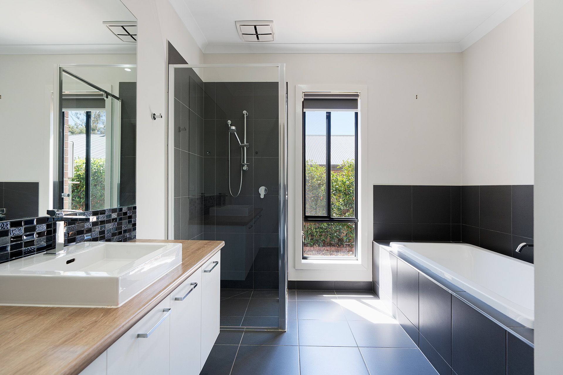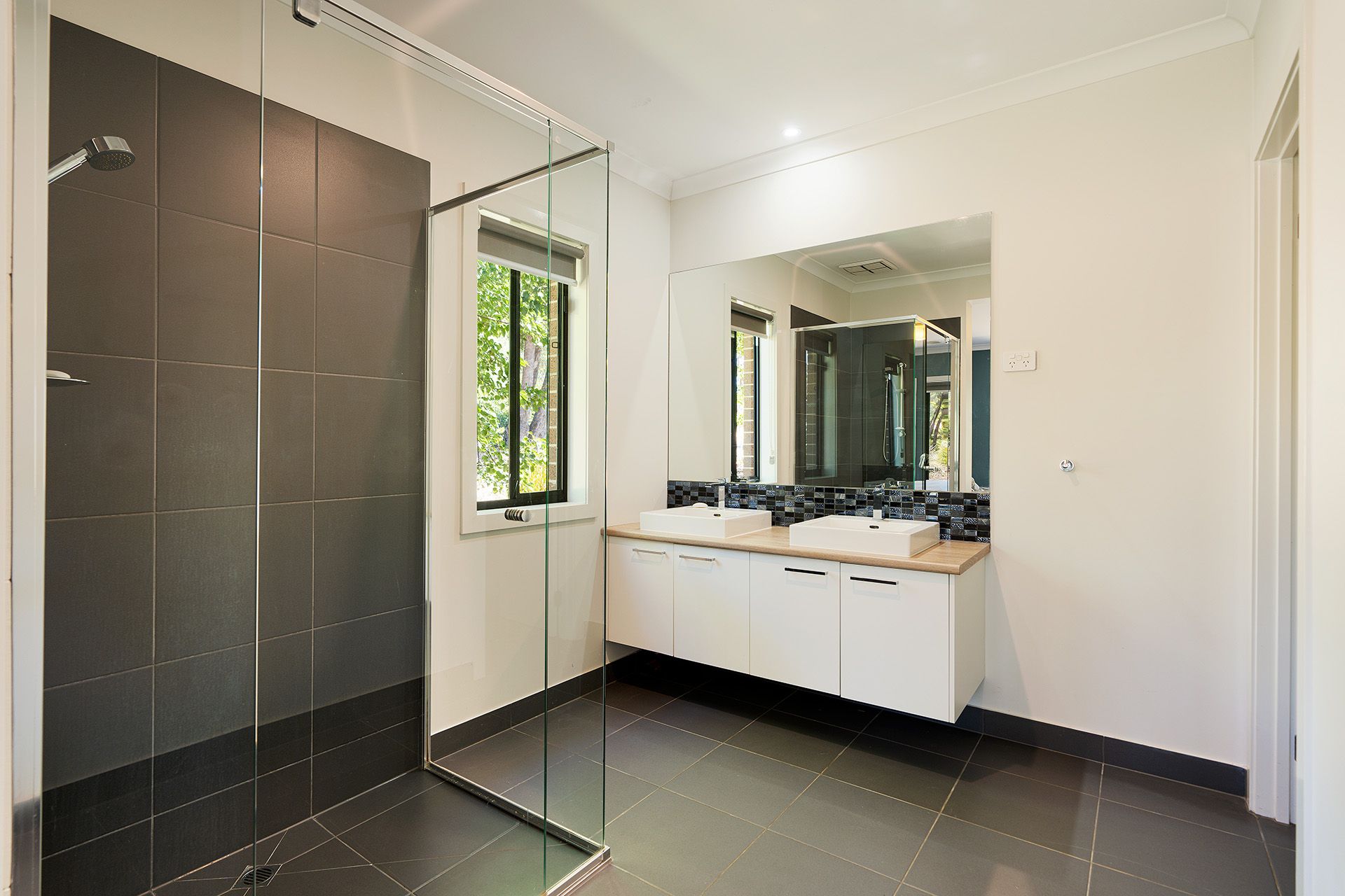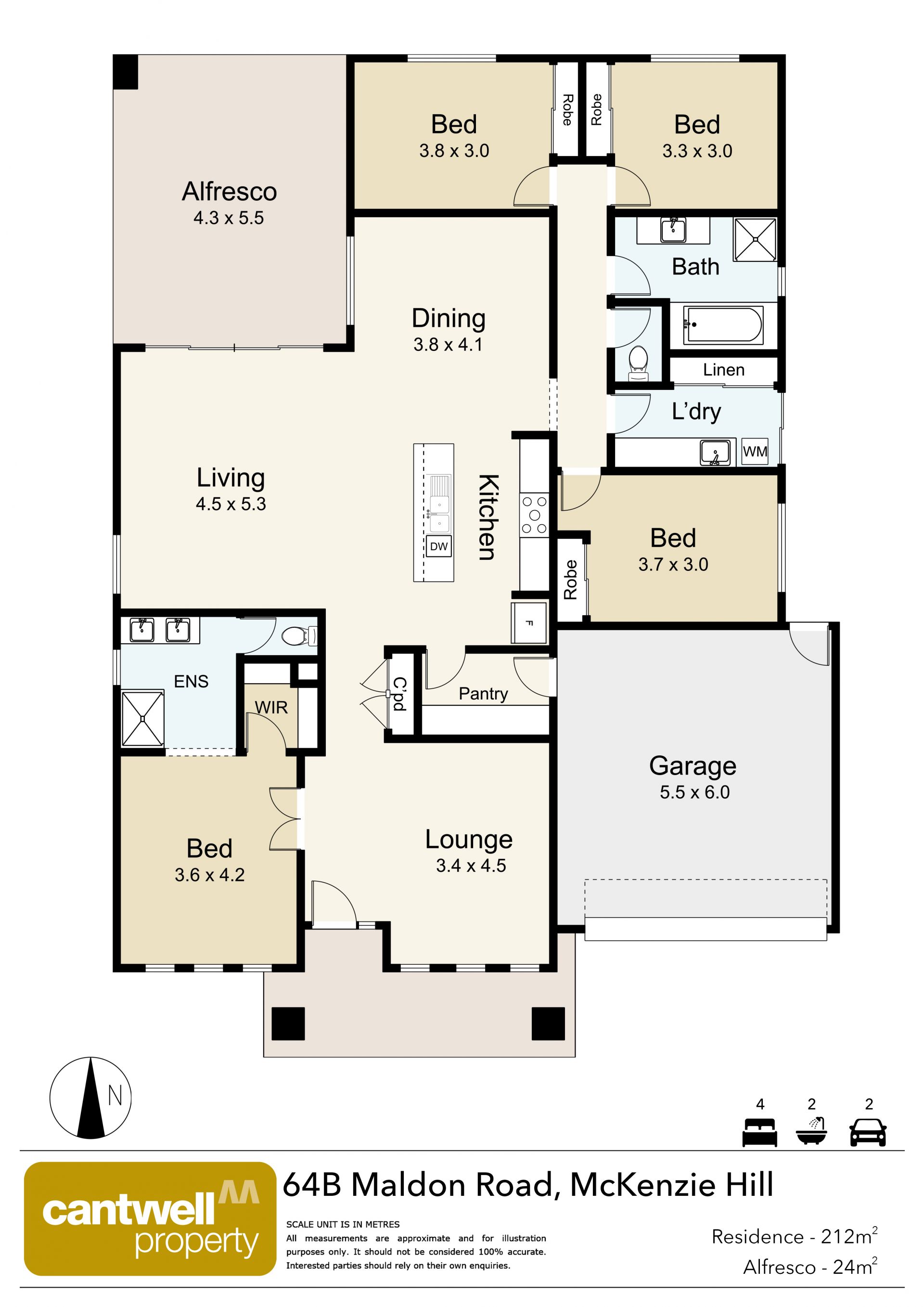 Formal living leads into a spacious north-facing open-plan kitchen, dining, and living space. The kitchen is a standout feature with its 900mm gas cooktop, oven, Caesarstone benchtops, island bench for casual dining, walk-in pantry, and dishwasher. Direct access from the kitchen to the double remote-controlled garage adds an extra layer of practicality. The living area opens onto the alfresco space with a ceiling fan, perfect for year-round entertaining and outdoor living.