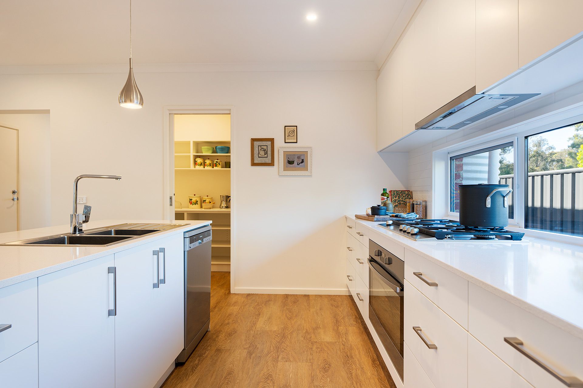 The open-plan design is filled with natural light thanks to a north-facing aspect. The sleek kitchen, the heart of the home, boasts a central island, a gas cooktop, an under-mount oven, a dishwasher, and a spacious walk-in pantry. The island bench provides casual dining, while the kitchen flows effortlessly into the dining and living areas, offering a flexible space for everyday living and entertaining. A sliding door opens to a large alfresco area, perfect for year-round outdoor gatherings. The main bedroom includes an ensuite and walk-in robe, while two additional bedrooms with built-in robes share a well-appointed central bathroom. A laundry with external access has storage. The secure garage provides internal and external access, and the home is equipped with double-glazed windows, ducted heating and cooling, and an integrated solar system for year-round comfort and energy efficiency.