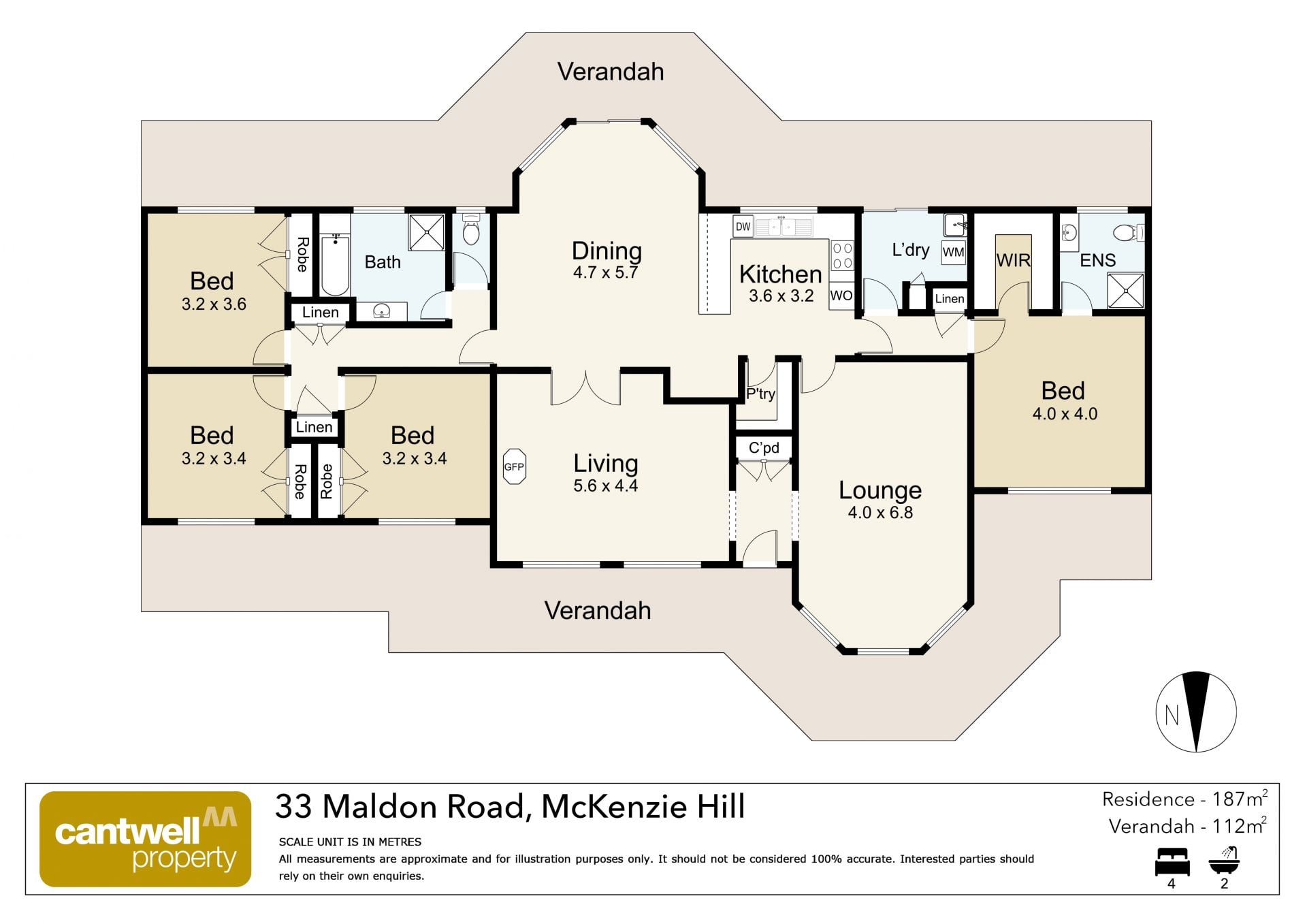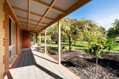 Designed with privacy in mind, the main bedroom is positioned at one end of the home and includes a walk-in wardrobe and an ensuite. At the opposite end, three additional bedrooms each have built-in robes and share a central bathroom with bath, shower, vanity, and separate toilet. A full-sized laundry provides external access, and the home also features front and rear verandas-north and south facing-offering shade, shelter, and the perfect spots to relax outdoors throughout the seasons.