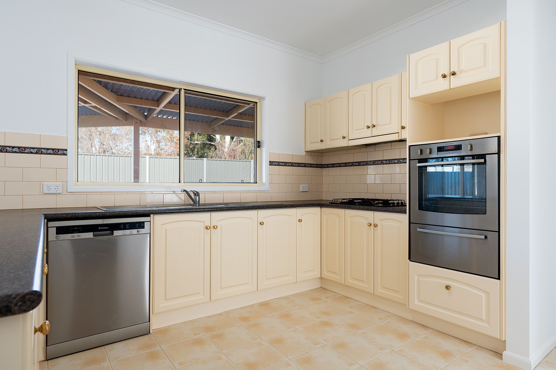The brick veneer home features two north-facing living areas that are filled with natural light-one with a charming bay window, the other with a gas log fire-offering warm and inviting spaces for everyday living or entertaining. The open-plan kitchen and dining area flows directly to the backyard and includes a gas cooktop, wall oven, dishwasher, and a walk-in pantry.