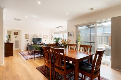 The main bedroom enjoys an outlook to the front garden and features a walk-in robe and ensuite, while two further bedrooms with built-in robes share a central family bathroom. A laundry with storage, and the secure garage offers both internal and rear yard entry. Comfort is assured year-round with ducted heating and evaporative cooling, a split-system, double-glazed windows, double blinds, and solar hot water with gas back-up.
