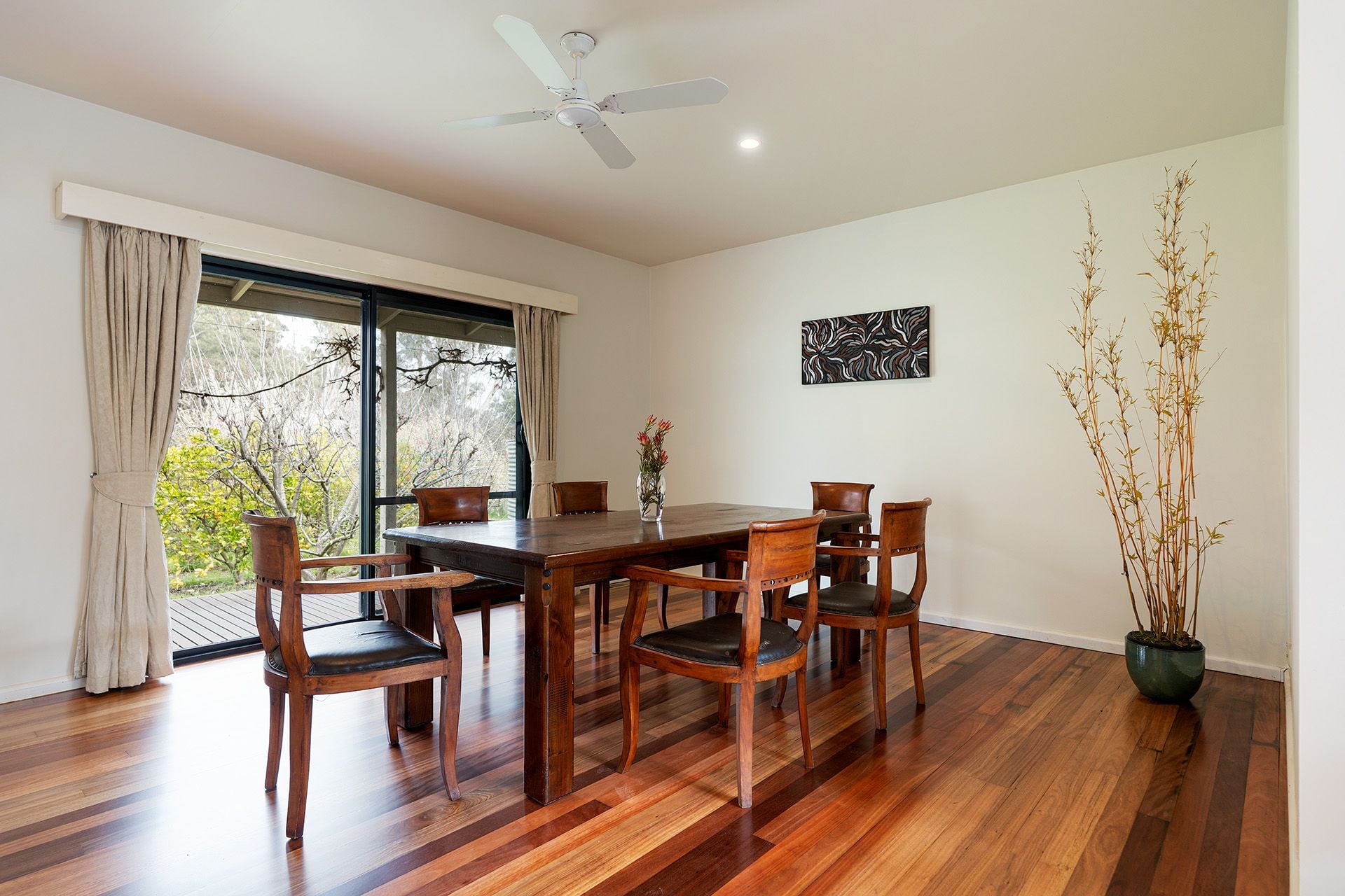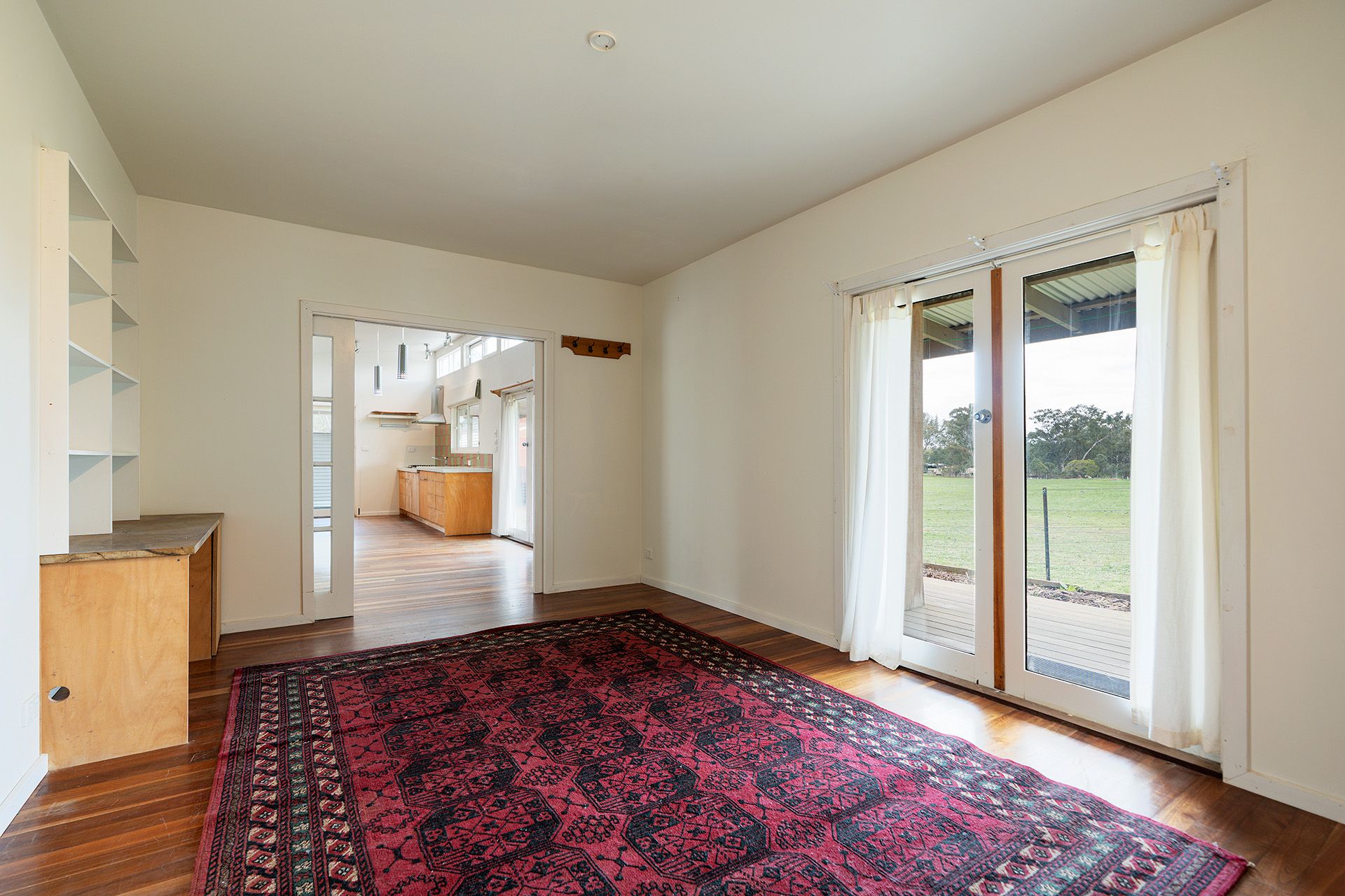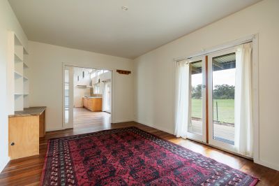 Thoughtfully designed to embrace natural light and seasonal comfort, the north-facing living area features soaring 4.2m angled ceilings, leadlight clerestory windows, and sliding doors that open to a wide verandah. The adjoining dining space flows to the south-side verandah, overlooking a citrus grove and orchard.