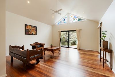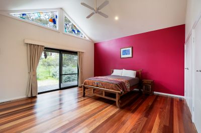Set on a beautifully landscaped parcel with regenerated bushland, this architecturally designed five-bedroom residence offers a seamless blend of passive solar design, self-sufficiency, and resort-style living, just minutes from Castlemaine.