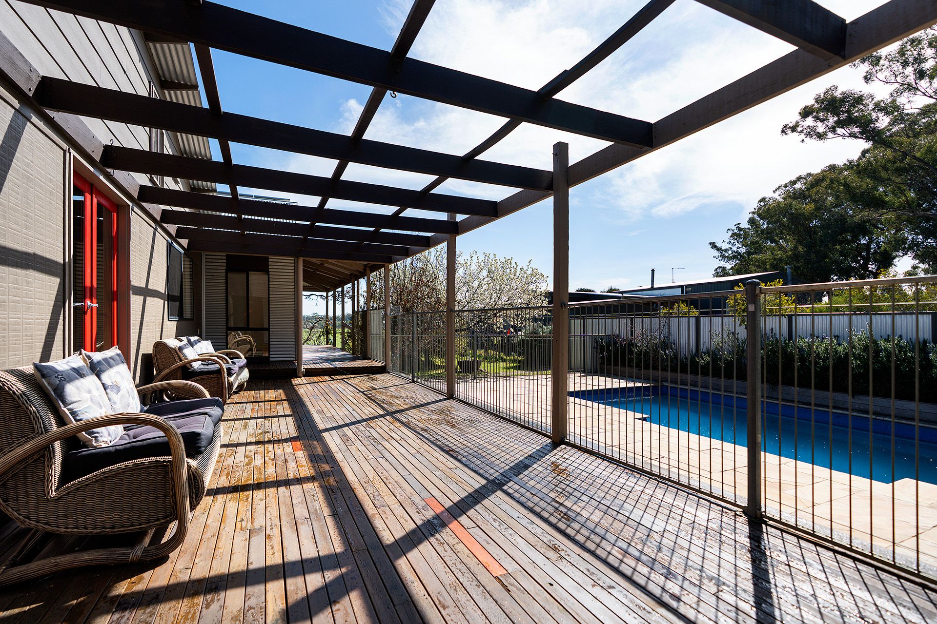 > Expansive entertaining deck with pergola