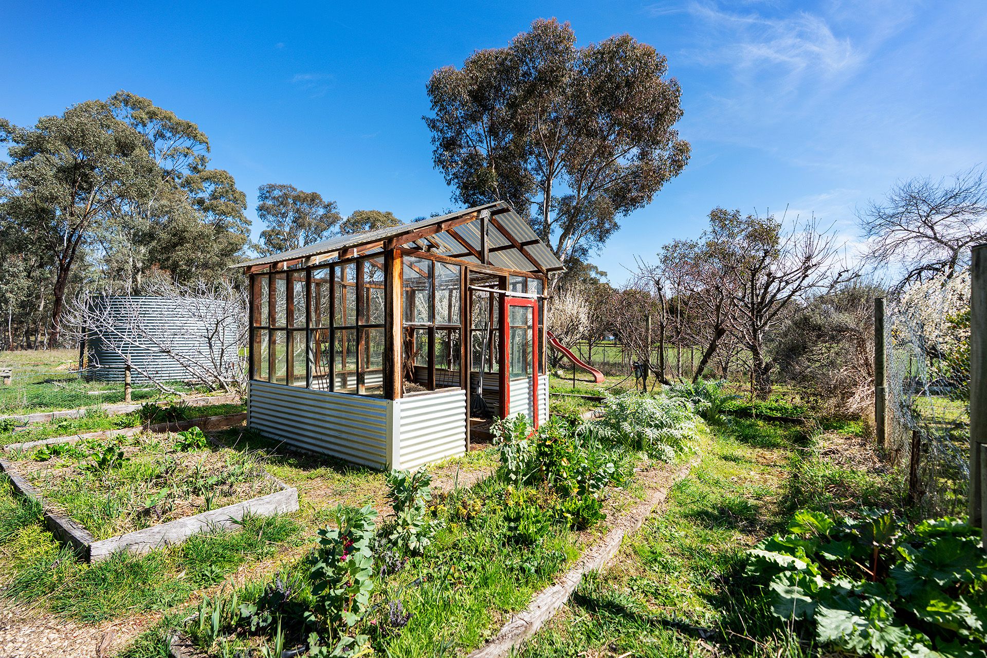 > Chook house, greenhouse, pizza oven, cubby house, a large dam stocked with redfin and yabbies, and a seasonal creek