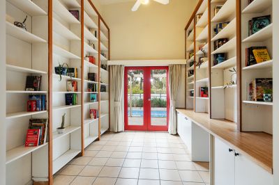 A curved ceiling leads to a library-style office space, featuring built-in shelving and French doors that open to the deck and pool area. The main bedroom suite enjoys high ceilings, clerestory windows, private verandah access, and an ensuite. Four additional bedrooms, each with built-in robes, are serviced by a central bathroom and a well-equipped laundry.