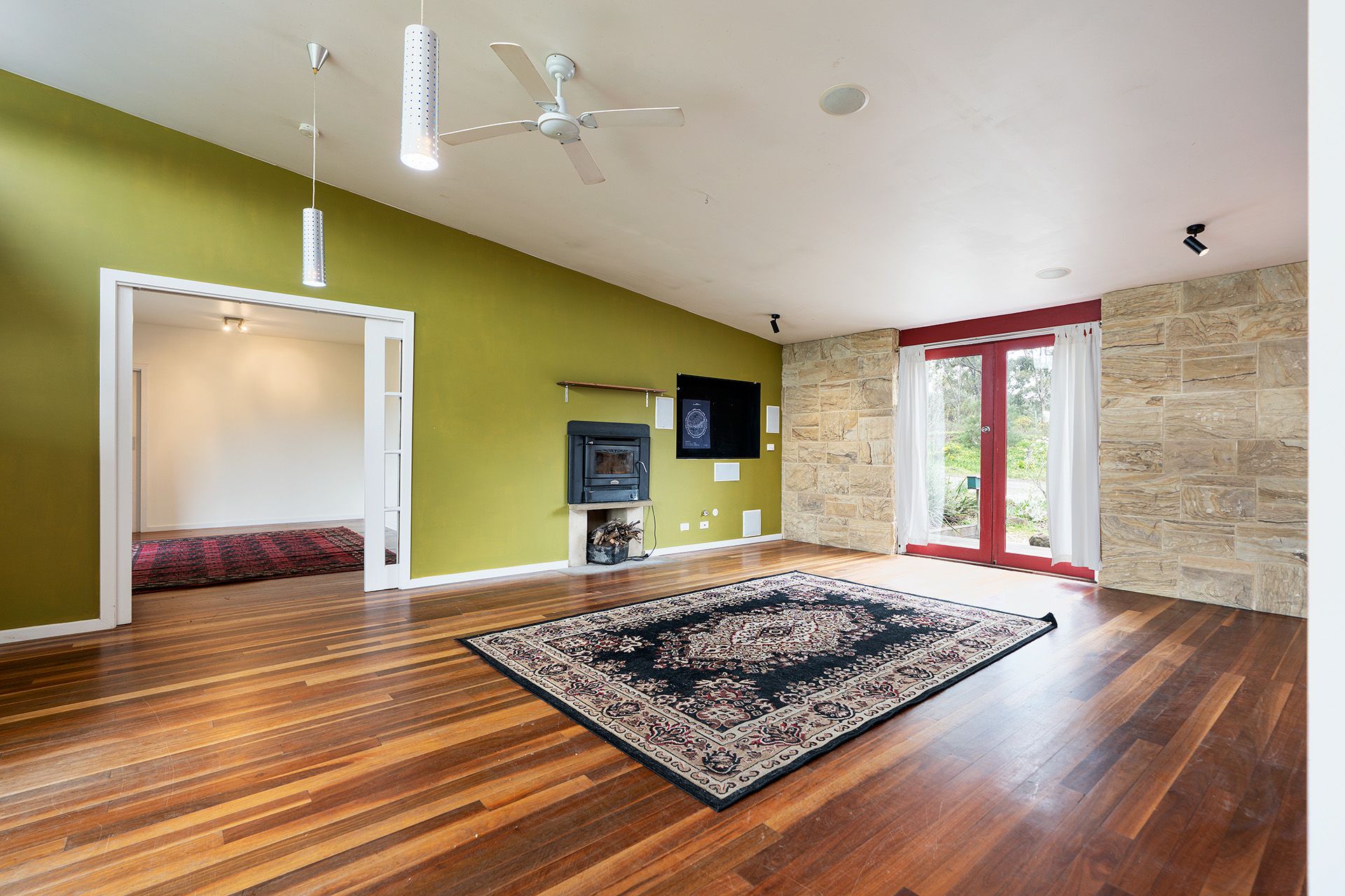 The kitchen overlooks the in-ground swimming pool and features a freestanding Ilve 900mm gas cooktop and oven, stone and timber benchtops, a walk-in pantry, Miele dishwasher, and a mobile island bench for flexible entertaining and extra storage. Open to the kitchen is a second living room with a Scandia Cuisine wood heater and baker's oven, creating a cosy heart to the home.