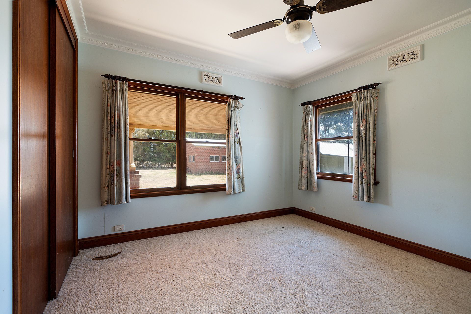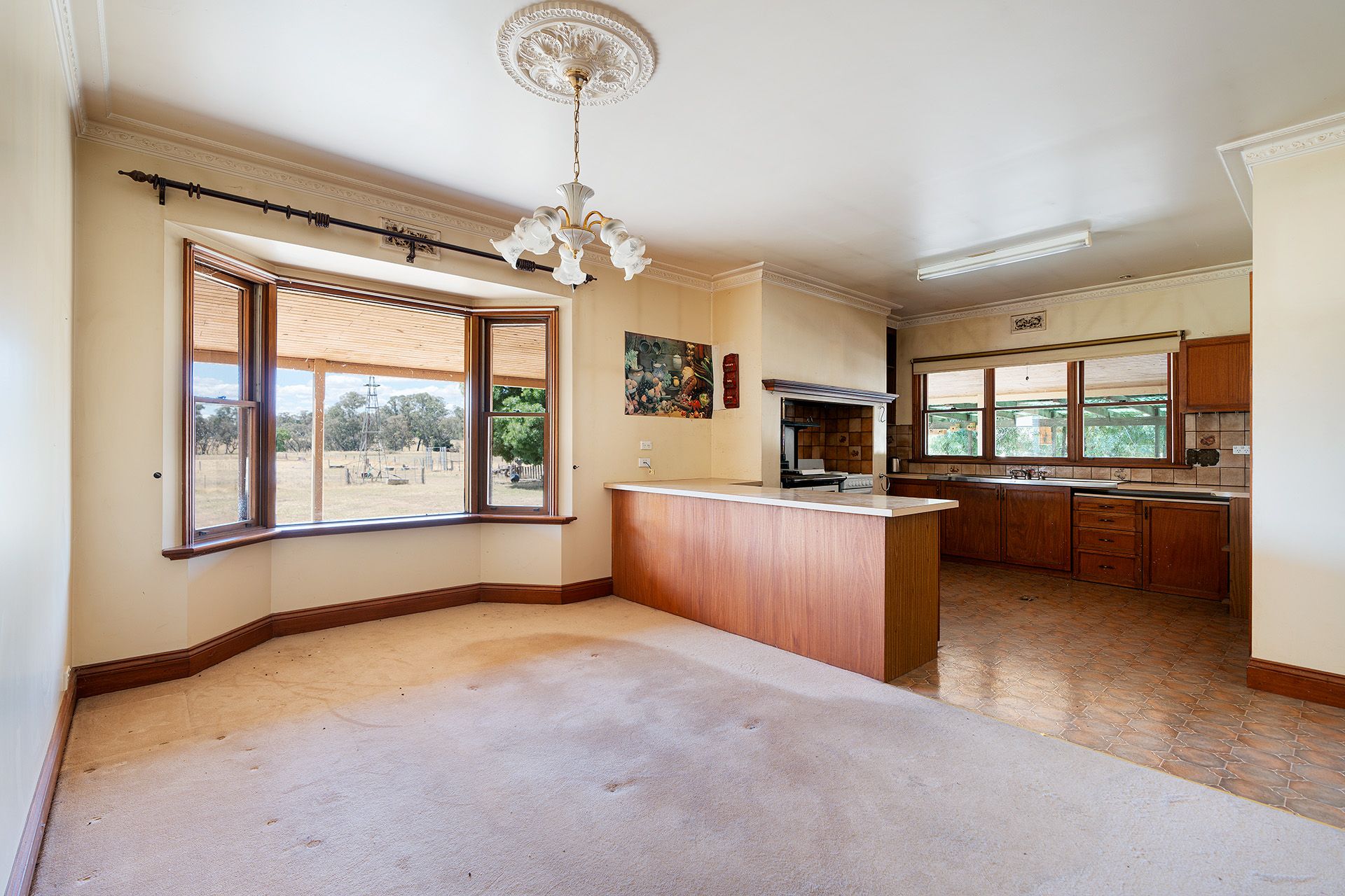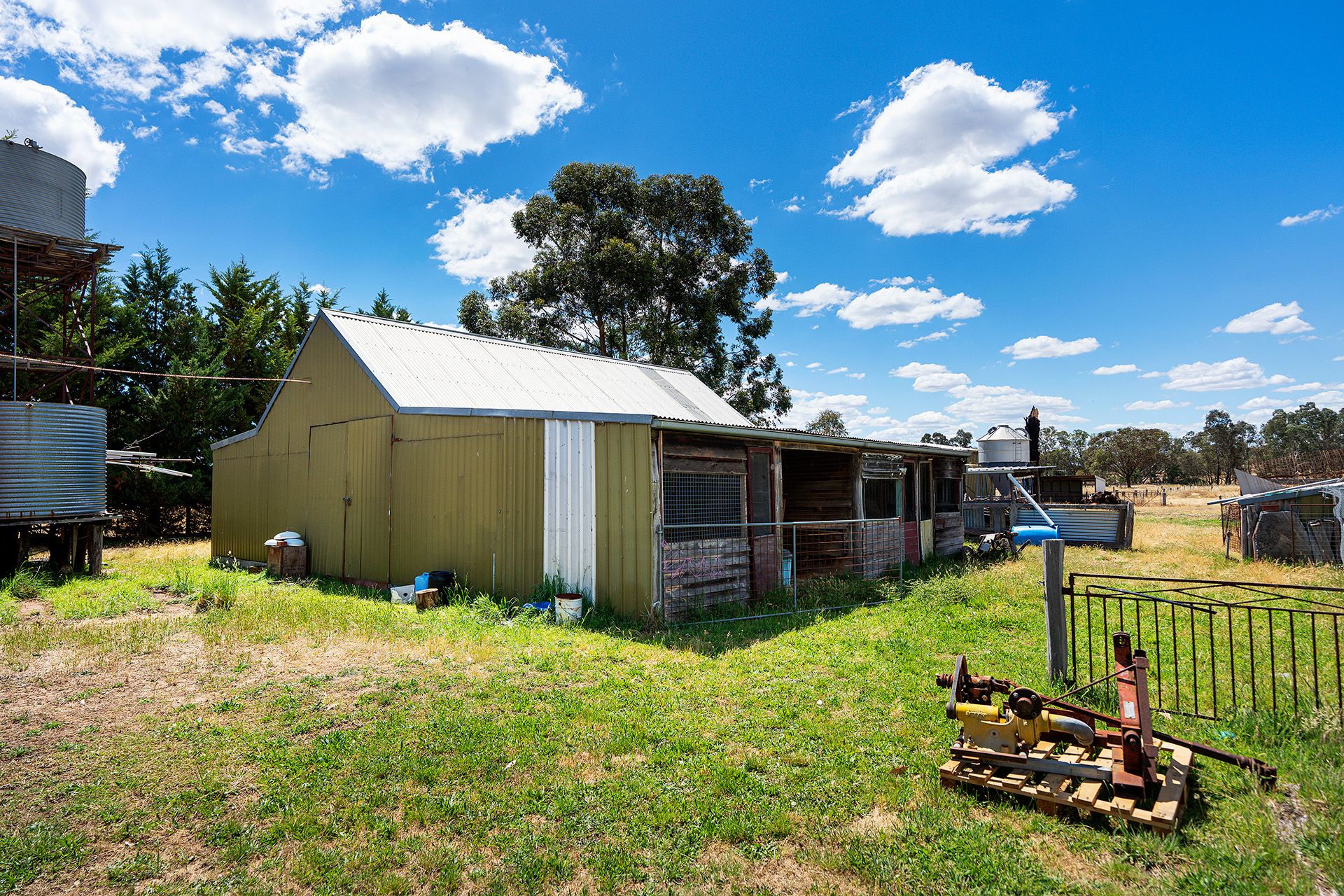 The wrap-around front verandah provides a lovely outdoor area to sit and enjoy the scenic views of the surrounding countryside, with established ash trees offering shade and privacy. The homestead has a large entrance hall that leads into a spacious, open-plan kitchen and north-facing dining area. The kitchen has an electric cooktop and a traditional Stanley solid wood cooker. The living room, with its two bay windows and open fireplace, provides a warm and inviting space to relax and entertain. The home features three generously sized bedrooms with built-in robes and two with bay windows. A large bathroom has a shower, bath, and vanity offering ample space for the whole family. A separate toilet is conveniently located off the laundry, which doubles as a mudroom with external access. The large 2.5m x 3.7m cellar and storeroom offer fantastic storage options. Additional details include an integrated solar system and ceiling fans.