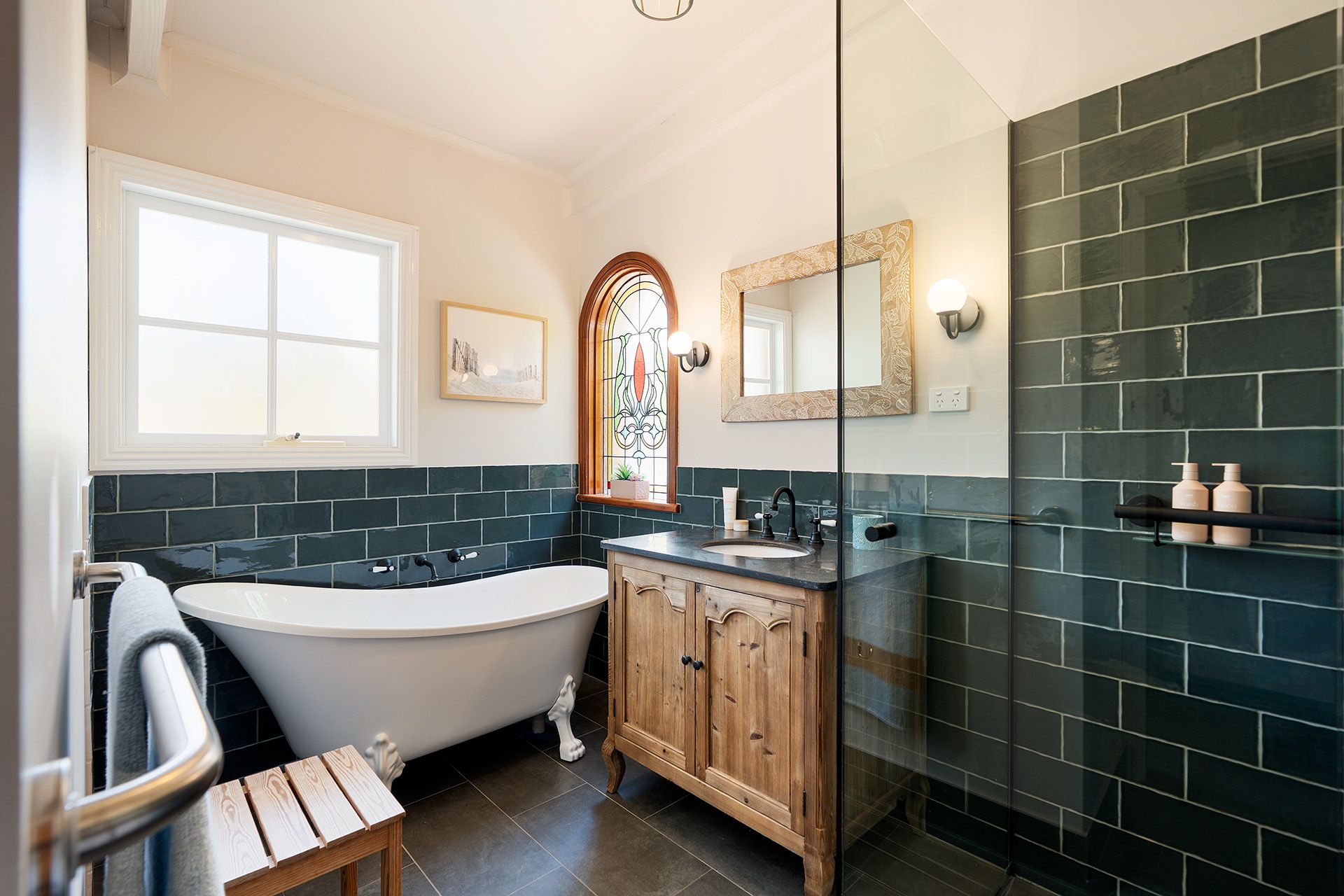 Accommodation includes three bedrooms, with the main offering a walk-in robe and garden views. The second bedroom includes built-in storage, while the upper level provides a spacious second living area with flexibility for a third bedroom, home office, or creative studio. The bathroom is a standout, with a clawfoot bath, large shower, and leadlight window adding character and elegance.