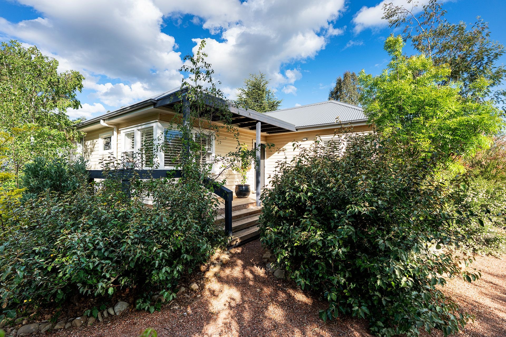 Outside, meandering paths wind through a thoughtfully landscaped garden featuring raised vegetable beds, ornamental and native plantings, shady trees, established hedging, and an outdoor bath with hot and cold water—ideal for soaking under the stars. The north-facing rear garden enjoys borrowed views of the landscape beyond and is alive with birdlife.