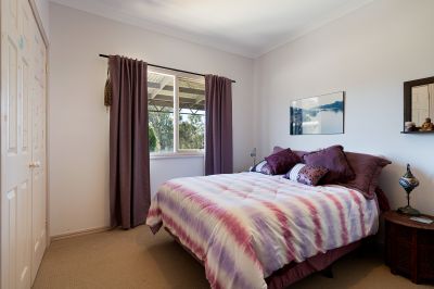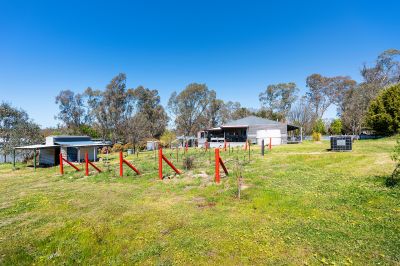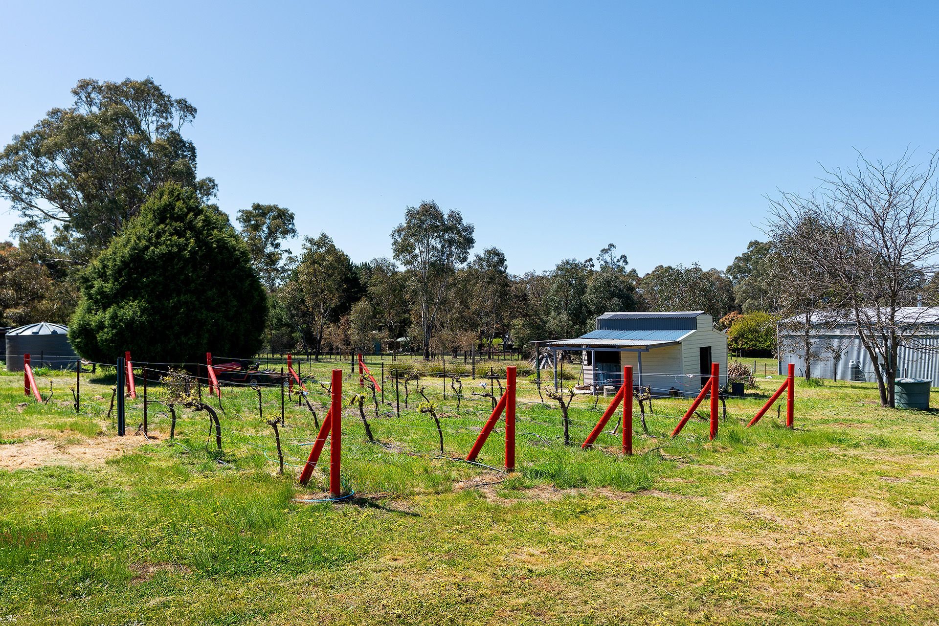 A verandah wraps around the house, a secure 4.5m x 6.3m garage has dual internal access, a 5.3m x 3.2m carport connected to a second 4.2m x 3.2m carport provides space for two cars, and a 7.4m x 3.2m workshop/ studio provides additional work/ storage space. Three water tanks provide water for the house, and the low-maintenance garden includes a small vineyard of Cabernet Sauvignon grapes. A 4m x 3.3m barn is perfect for wood storage or as a chicken house.
