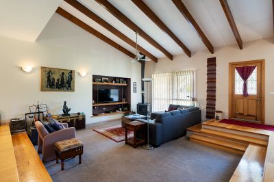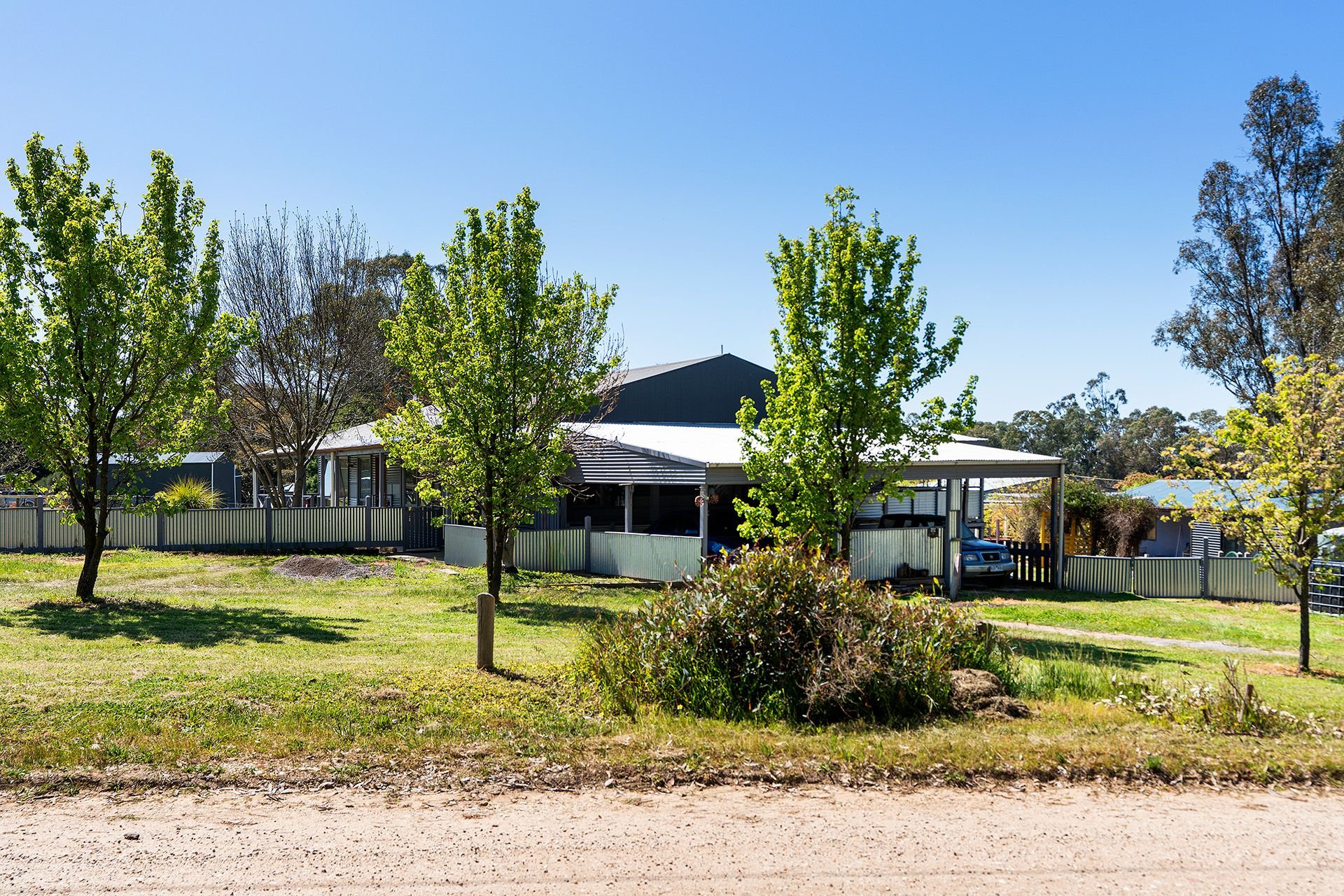 The corrugated-clad home features entry into the spacious living with a high-raked ceiling with beams and a sunken lounge area with a solid wood heater, built-in storage, and a ceiling fan. The space is open to the dining with a split system and a sliding door leading to a wrap-around verandah with two covered entertaining areas. Adjoining the dining area is the kitchen, which has an outlook over the grounds. The kitchen provides an electric cooktop, a wall oven, a Miele dishwasher, timber benchtops and a walk-in pantry. Two spacious bedrooms have built-in robes, and a room off the dining provides an ideal space for a home office. Servicing the home is a bathroom with a shower, a bath and a vanity and a laundry has external access and access to the garage with a toilet.